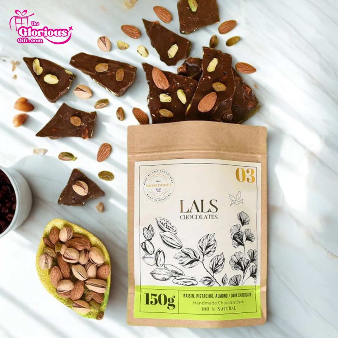 - 150 grams of Raisins, Pistachio, and Almonds in a Dark Chocolate Bark Pouch