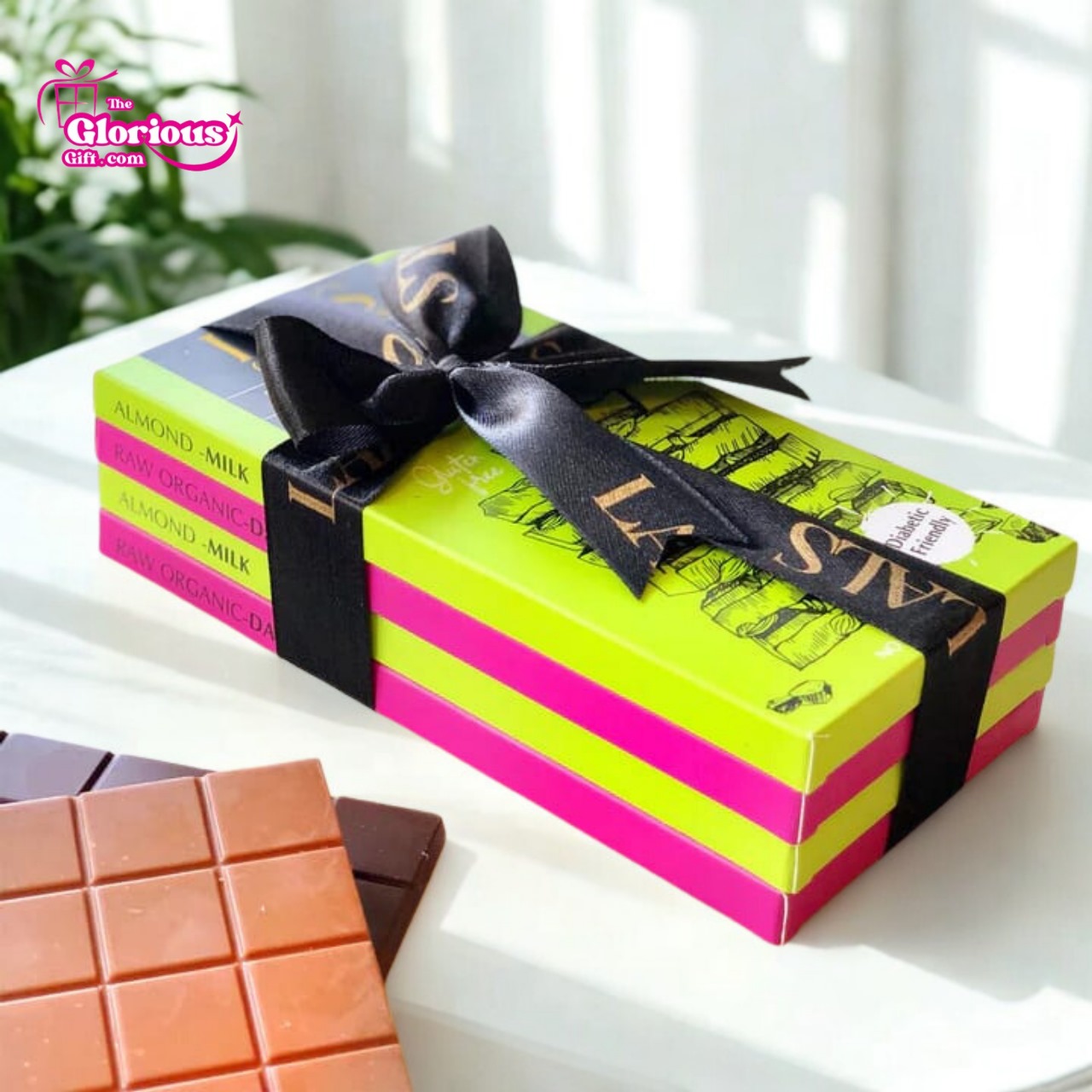This diabetic-friendly bundle includes 4 bars; 2 Almond Milk & 2 Raw Organic Dark. Handcrafted in Karachi, Pakistan. This is a better-for-you bar that is made with cocoa butter & natural vanilla. Send chocolate bar set.