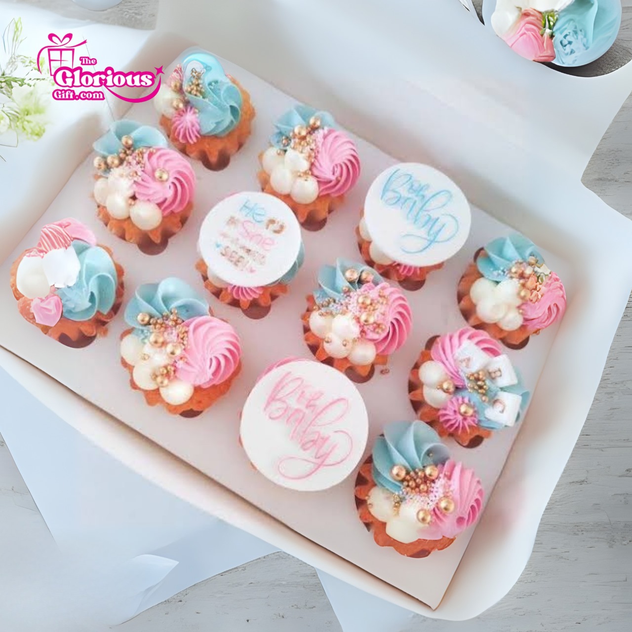 A dozen adorable cupcakes, perfectly crafted to celebrate the arrival of a newborn with sweetness and joy.