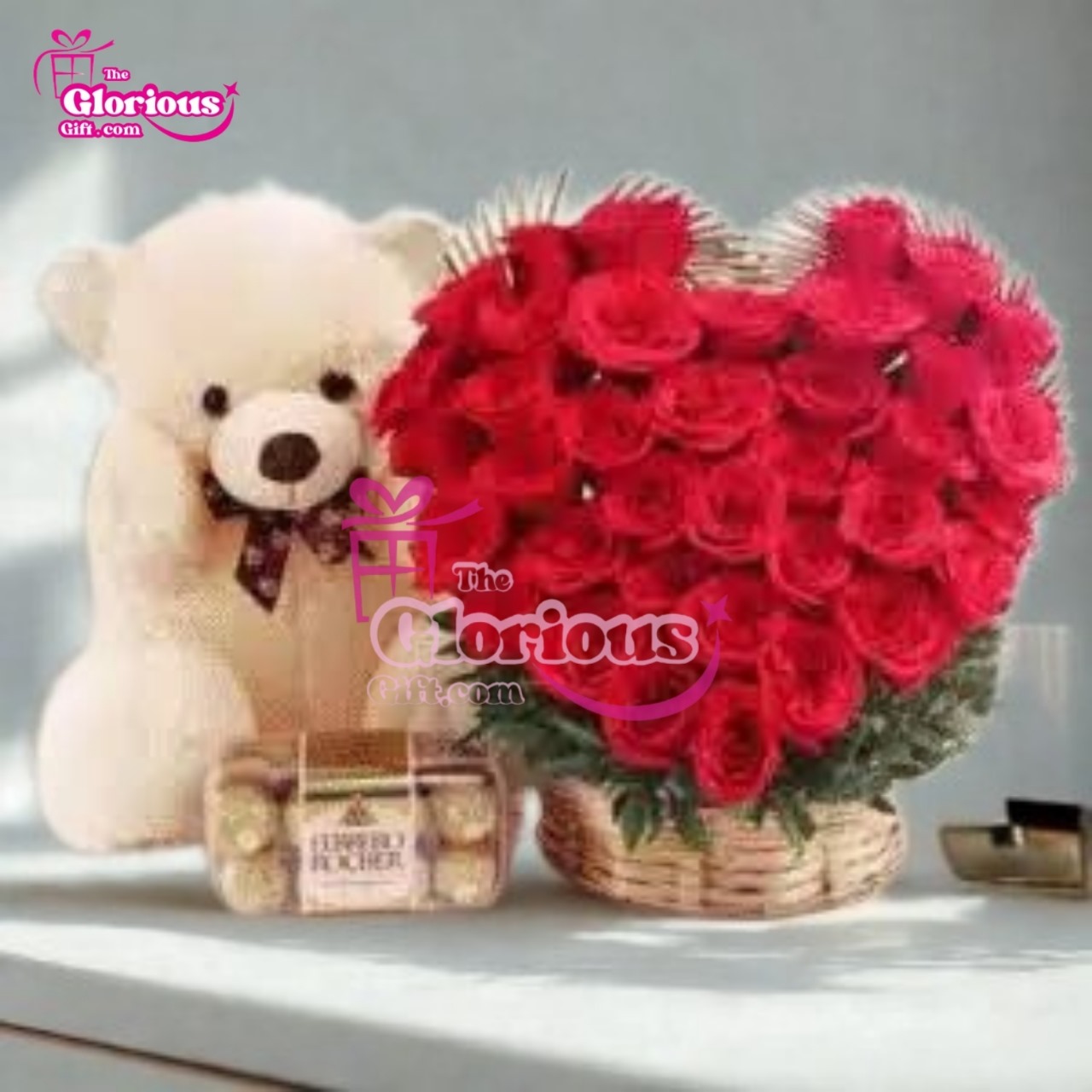 Express your love with this beautiful combo that speaks straight from the heart. A charming teddy bear, paired with a delightful box of Ferrero Rocher chocolates, perfectly complements the stunning heart-shaped basket of fresh red roses. A thoughtful gift to make any moment unforgettable.