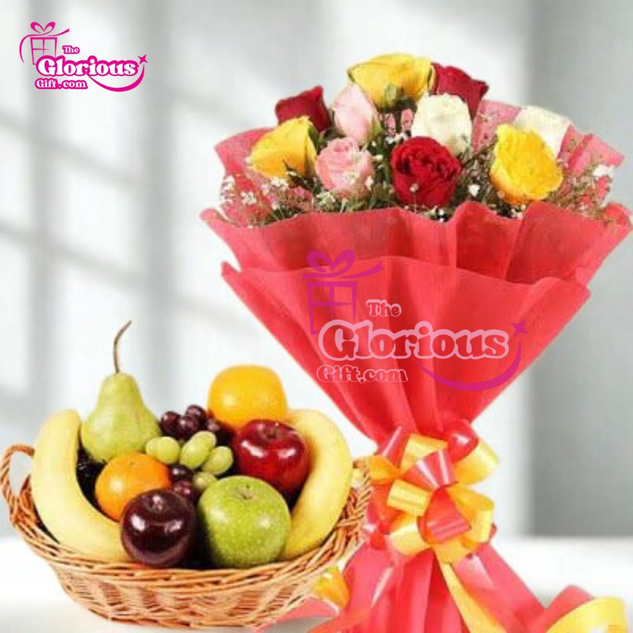 Enjoy the natural sweetness with this Fruit Basket with Beautyfull Mix Roses — A refreshing gift of health and taste. Perfect for sharing love and care with family and friends on Eid, Ramadan, birthdays, weddings, or as a get well soon surprise.
