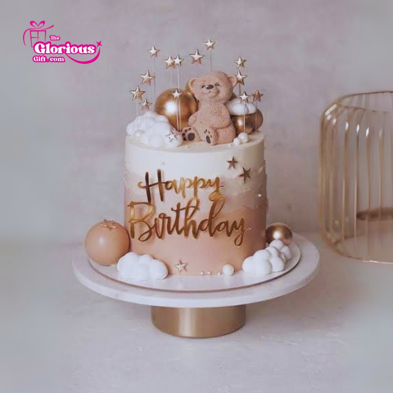 Adorned with a cute little teddy bear and delicate floral designs, this cake blends charm, beauty, and sweetness to make birthdays unforgettable. Soft, elegant, and festive, it is the perfect centerpiece for a joyful celebration.