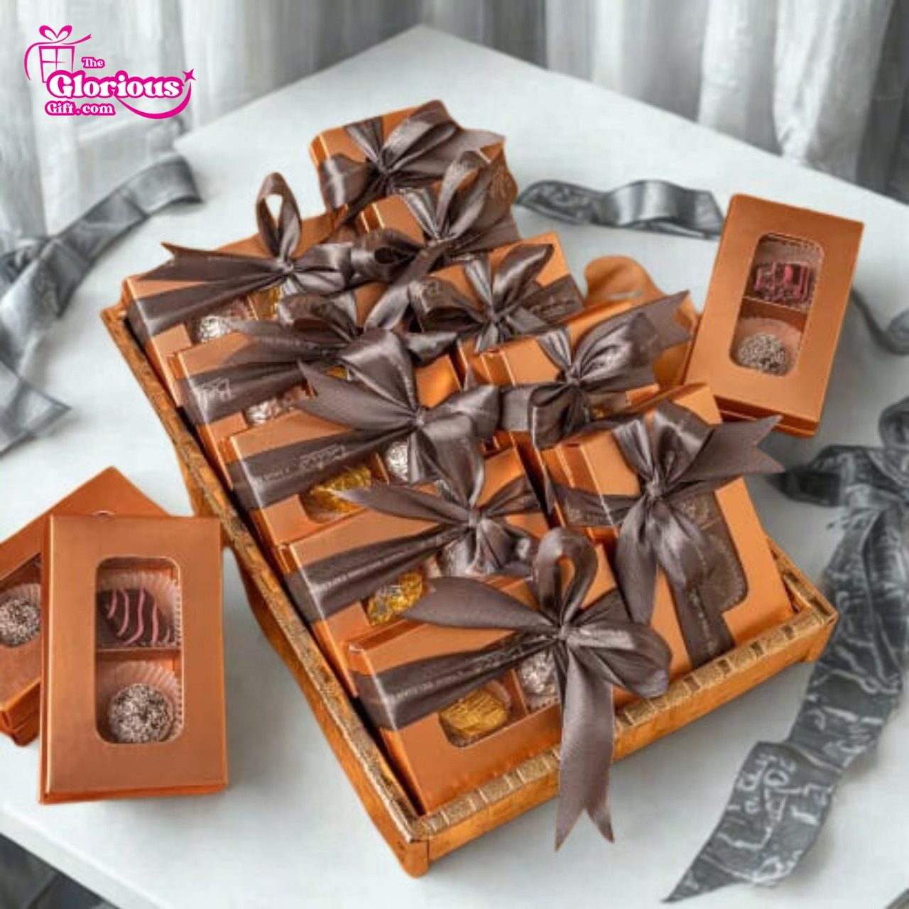 Beautifully decorated handmade Gold Leather Tray filled with delicious chocolate pralines in congratulations-themed packaging. Surprise them this month by sending this combo gift package. Express your love and show how much their special moments mean to you. Bring happiness to your beloved with this luxurious and precious gift tray, a perfect symbol of celebration and care.