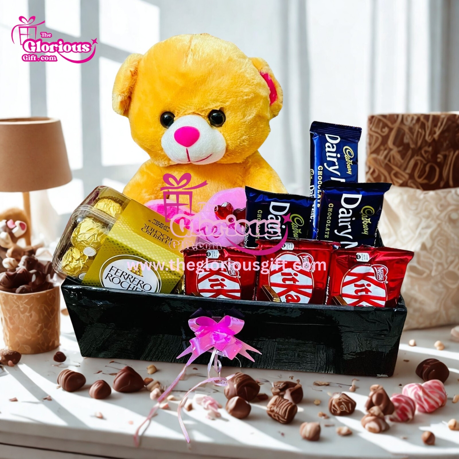 A delightful gift box featuring a cuddly teddy and premium chocolates, perfect for spreading love and sweetness on any special occasion.